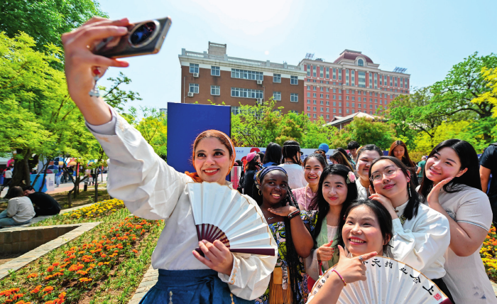中外青年在以“上合之約 天外同彩”為主題的天津外國語大學第八屆國際文化節上合影留念(2025年4月20日攝)孫凡越攝/本刊