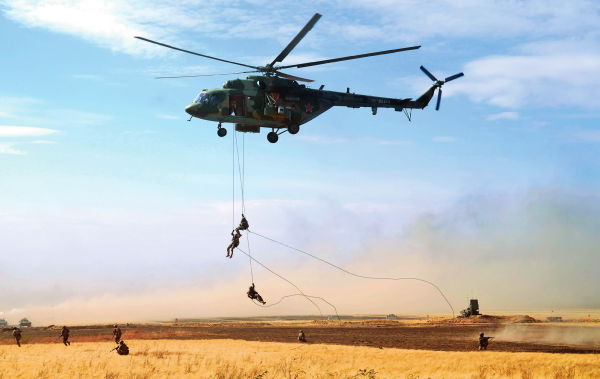 在俄羅斯奧倫堡州東古茲靶場舉行的“和平使命-2021”上海合作組織聯合反恐軍事演習實兵實彈演習中,多國聯合部隊特戰分隊執行索降作戰任務(資料照片) 梅世雄攝/本刊